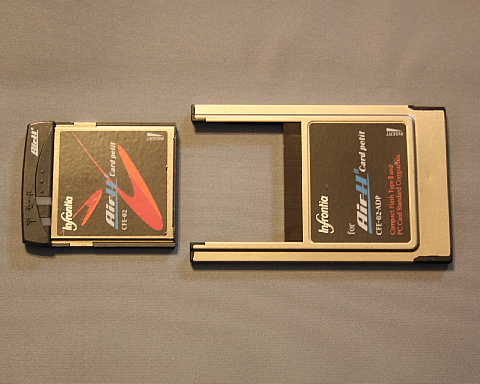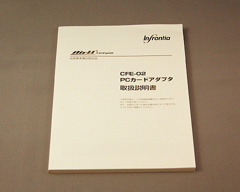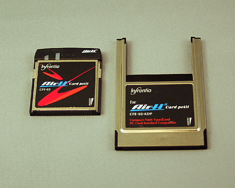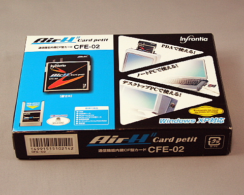 NECインフロンティアのAir H"、通信機能内蔵CF型カードCFE-02。 32kパケット通信対応。 CFカード型だが、アダプタ付属でPCカードスロットにも対応。 32kパケットのほか、32kPIAFS、64kPIAFS(ベストエフォート方式)にも対応。 それにしても32kパケット通信は遅い。 2002年5月17日、ヨドバシカメラ千葉店にて機種変更。 2005年7月6日に解約、京ポンに一本化。 3年1ヶ月間使用。 (2006-2-5 記)